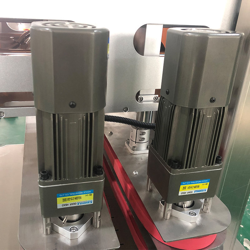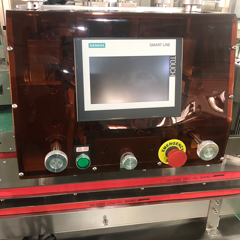 连续式旋盖机生产线在工作过程中,主要是通过输送将所需旋盖的容器有序的输送至旋盖区域,当瓶子进入旋盖工位前,全自动夹盖旋盖机将杂乱的瓶盖进行整理、排序,它的工作内容可通过显示屏的设定来执行运作,在完成调试内容后,按下启动按钮,连续式旋盖机生产线开始通过输送轨道将所需旋盖的容器进行定位,此时两边的夹瓶装置快速运作,将瓶子稳稳的夹紧,同时瓶盖自动套在瓶口上。压盖装置先将瓶盖压至预紧状态,随后高速旋转的旋盖机构通过摩擦力,将瓶盖紧紧的旋盖在瓶身,使其产品得到密封效果。