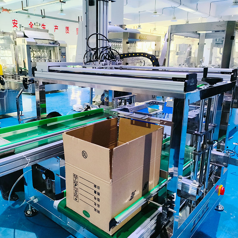 全自动装箱机属于高灵敏度的机械设备,它的装箱方式是通过光电传感检测后的纸箱后,将其定位并通过输送线送至封箱工位,此时的折叠机开始对准箱体进行自动折叠,封箱码垛一体机启动,此时的胶带同步对纸箱进行封口操作,封箱完成时,输送带则会对纸箱推送进入码垛工位,码垛工位的传感器同样会将信号传输至PLC控制中心,系统则会根据预设的码垛程序确定机械手的抓取与堆叠,全自动装箱机通过堆叠抓取夹具将纸箱抓起,随后移动到指定的位置,比确保纸箱折叠、粘贴、装箱、码垛、成品输出的全部工作流程。
